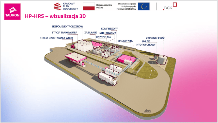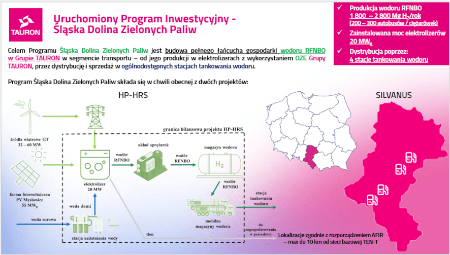 Wodór produkowany w instalacji HP-HRS będzie sprężany i magazynowany w mobilnych magazynach wodoru pod ciśnieniem 380 bar o pojemności 1 tony wodoru każdy – dodatkowo dostępny będzie stacjonarny magazyn wodoru o pojemności do 8 tonH2. Te mobilne jednostki będą wykorzystywane do dystrybucji wodoru do stacji tankowania SILVANUS, zlokalizowanych w czterech punktach województwa śląskiego, zgodnych z siecią TEN-T i wymaganiami rozporządzenia AFIR. Dzięki temu zapewniona zostanie pełna kompatybilność systemu produkcji i dystrybucji wodoru z infrastrukturą tankowania, co umożliwi efektywne funkcjonowanie całego ekosystemu wodorowego. Wodór RFNBO produkowany w HP-HRS będzie spełniał wszystkie wymagania jakościowe dla pojazdów FCEV, zgodnie z normą ISO 14687. Instalacja będzie wyposażona w systemy oczyszczania, sprężania, magazynowania oraz inertyzacji, a także w układy pomocnicze: uzdatniania wody, chłodzenia, kanalizacji, oczyszczania ścieków i zasilania energetycznego. W dniu 03.09.2025 r. TAURON podpisał z Bankiem Gospodarstwa Krajowego umowę nr KPOD.03.18-IW.05-0004/25 o objęcie przedsięwzięcia wsparciem dotyczącą Przedsięwzięcia pt. „HP-HRS - rozwój elektromobilności w województwie śląskim poprzez budowę innowacyjnej instalacji do produkcji wodoru RFNBO” w ramach Inwestycji B2.1.1. „Inwestycje w technologie wodorowe, wytwarzanie, magazynowanie i transport wodoru” .