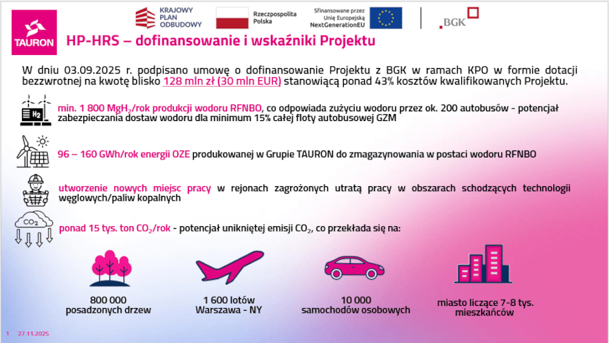 Projekt HP-HRS wpisuje się w cele Strategii Grupy TAURON na lata 2025–2035, w tym w priorytety: „Rentowny wzrost mocy w OZE i magazynach energii” oraz „Dekarbonizacja i podniesienie efektywności ciepła”. Wodór RFNBO produkowany w HP-HRS będzie wykorzystywany nie tylko w transporcie, ale także w przemyśle, energetyce i ciepłownictwie, co zwiększa jego znaczenie jako strategicznego nośnika energii w procesie transformacji energetycznej.